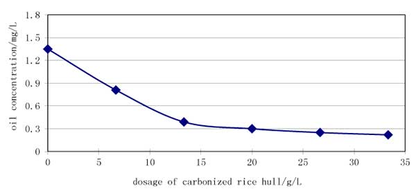 制備了六種海水(750ml)和活性炭(不同量的0,5,10,15,20和25g)的混合物,相應(yīng)于活性炭劑量0.00,6.67,13.33,20.00,26.67,33.33g / L ,吸附后的油濃度結(jié)果如圖2所示。海水初始油濃度為1.35 mg / L。如圖2所示,在活性炭劑量低于13.33 g / L時(shí),油濃度迅速下降,最低濃度為0.39 mg / L。然而,隨著活性炭劑量的進(jìn)一步增加,沒有明顯的油濃度下降,在實(shí)驗(yàn)條件下最低油濃度為0.22mg / L。