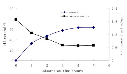 吸附效率在第一個(gè)小時(shí)內(nèi)迅速增加,三小時(shí)吸附后趨于穩(wěn)定,最大除油率為71%。三小時(shí)后沒有出現(xiàn)明顯的除油增加,相反,由于解吸過程出現(xiàn)少量的油濃度增加。結(jié)果,活性炭的最佳吸附時(shí)間是三小時(shí)。