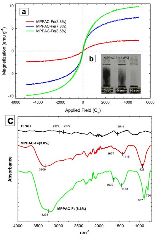 圖:3(a)所有磁化活性炭材料的磁化強度與施加的磁場之間的關(guān)系,(b)顯示了由外部磁體懸浮的磁化杏花天的沉降時間,(c)活性炭,磁化活性炭-Fe(3.8%)和-Fe(8.6%)的FTIR光譜。