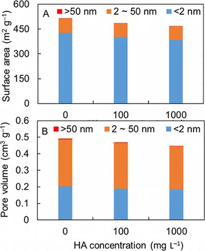 圖1.(A)在孔徑為<2nm,2-50nm和> 50nm的0,100 和1000mg L -1活性炭的孔體積中吸附的腐殖酸溶液。(B)在孔徑為<2nm,2-50nm和> 50nm的0,100 和1000mg L -1 活性炭的孔體積中吸附的腐殖酸溶液。