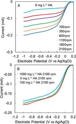 圖2.(A)0mg L -1 活性炭吸附腐殖酸溶液在不同轉速下的電流-電位曲線。(B)用0,100和1000mg L -1 活性炭吸附腐殖酸溶液在2100rpm下的電流-電位曲線。