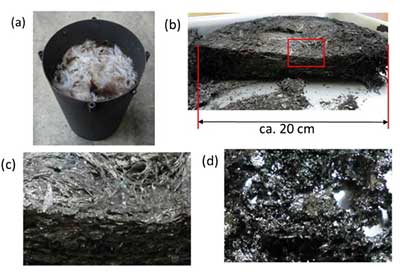 圖1。在800 ℃ 熱處理后得到的原料和方法:a)在不銹鋼反應器中引發羽毛,b)由羽毛和酚醛樹脂以1:1的質量比(F1Ph1) c)羽毛活性炭。