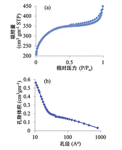 圖3。(a)活性炭的吸附-解吸等溫線; (b)活性炭的孔徑分布。